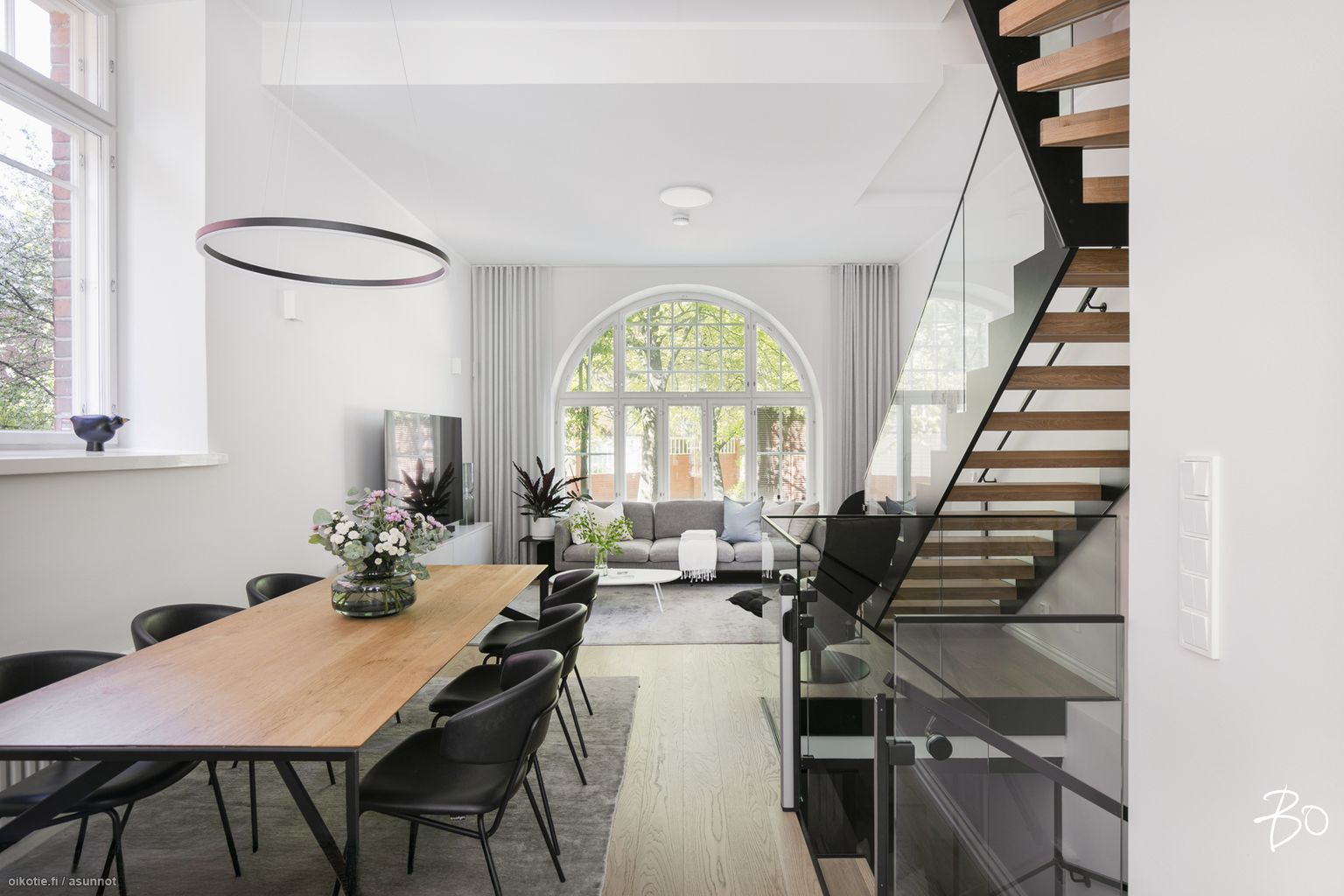 Valo tulvii sisään kolmesta eri suunnasta, ja kaareva erkkeri tuo tilaan galleriamaista tunnelmaa.
