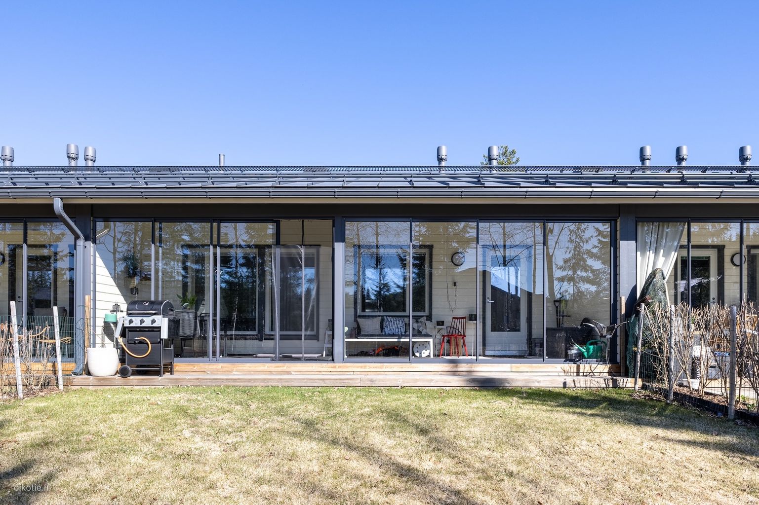 Isokokoinen lasitettu terassi ja oma piha etelän suuntaan tarjoavat runsaasti lisätilaa ja yksityisyyttä.